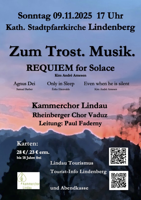 Lindenberg Lindenberg, GermanyAls Hauptwerk wird das Requiem for Solace von Kim André Arnesen (*1980) aufgeführt. Neben dem Hauptwerk werden wir drei weitere Chorwerke aufführen, die das Programm komplettieren. Das Agnus Dei von Samuel Barber […]
