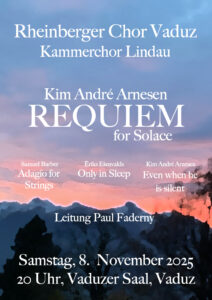 Am 8. November 2025 führten wir gemeinsam mit dem Kammerchor Lindau im Vaduzer Saal das "Requiem for Solace" von Kim André Arnesen auf. Neben dem Hauptwerk haben wir „Only in Sleep“ von Ēriks Ešenvalds sowie das ebenfalls von Kim André Arnesen stammende „Even when he is silent“ gesungen. Am 9, November präsentierten wir dasselbe Konzert nochmals in Lindenberg.